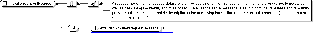 Documentation A request message that passes details of the previously negotiated transaction that the transferor wishes to novate as well as describing the identity and roles of each party. As the same message is sent to both the transferee and remaining party it must contain the complete description of the underlying transaction (rather than just a reference) as the transferee will not have record of it.