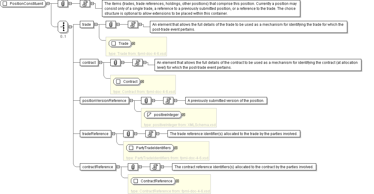 | Documentation | The items (trades, trade references, holdings, other positions) that comprise this position. Currently a position may consist only of a single trade, a reference to a previously submitted position, or a reference to the trade. The choice structure is optional to allow extensions to be placed within this container. |