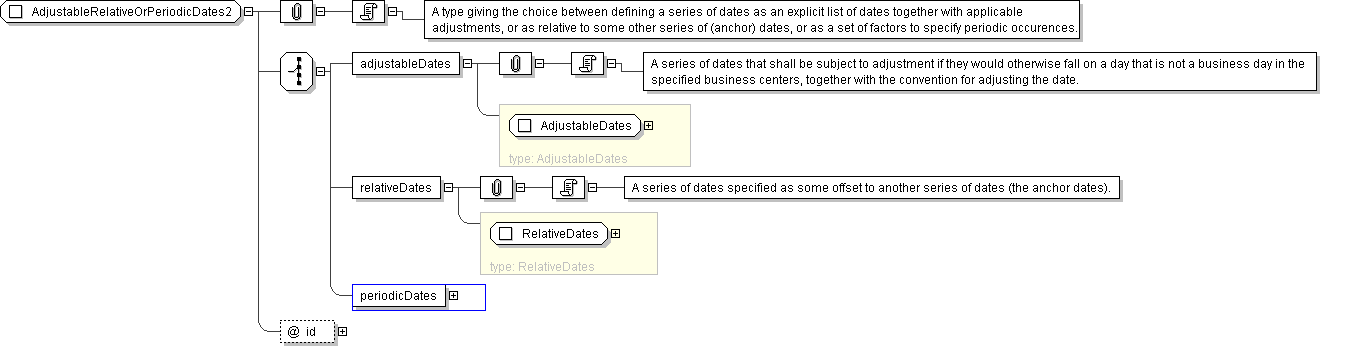 | Documentation | A type giving the choice between defining a series of dates as an explicit list of dates together with applicable adjustments, or as relative to some other series of (anchor) dates, or as a set of factors to specify periodic occurences. |
