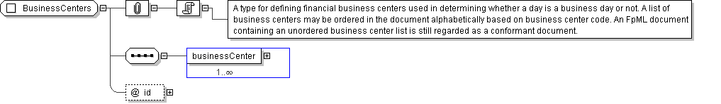 | Documentation | A type for defining financial business centers used in determining whether a day is a business day or not. A list of business centers may be ordered in the document alphabetically based on business center code. An FpML document containing an unordered business center list is still regarded as a conformant document. |