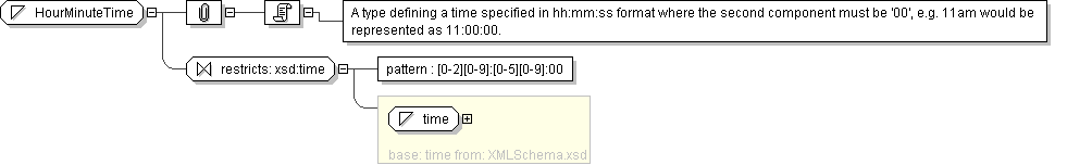 Documentation A type defining a time specified in hh:mm:ss format where the second component must be '00', e.g. 11am would be represented as 11:00:00.