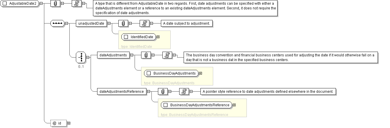 Documentation A type that is different from AdjustableDate in two regards. First, date adjustments can be specified with either a dateAdjustments element or a reference to an existing dateAdjustments element. Second, it does not require the specification of date adjustments.