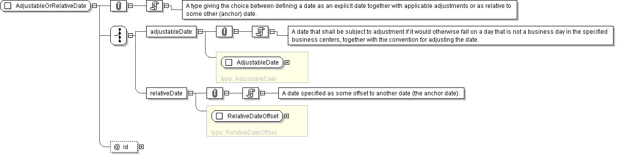 | Documentation | A type giving the choice between defining a date as an explicit date together with applicable adjustments or as relative to some other (anchor) date. |