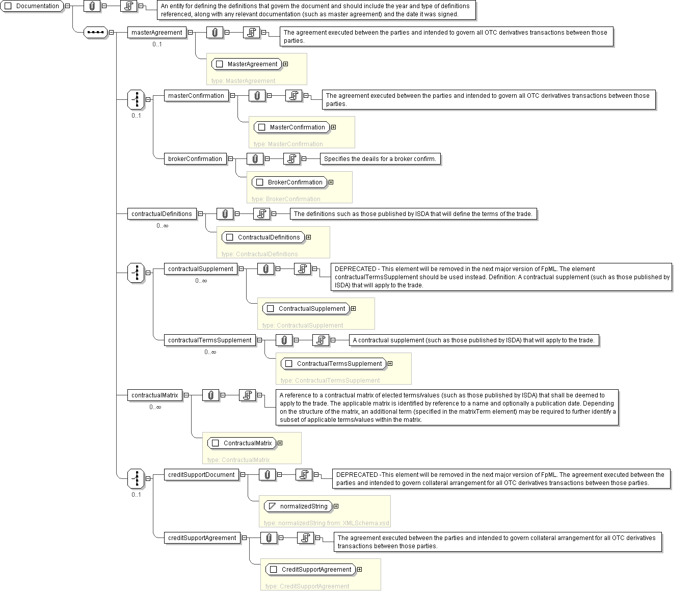 | Documentation | An entity for defining the definitions that govern the document and should include the year and type of definitions referenced, along with any relevant documentation (such as master agreement) and the date it was signed. |