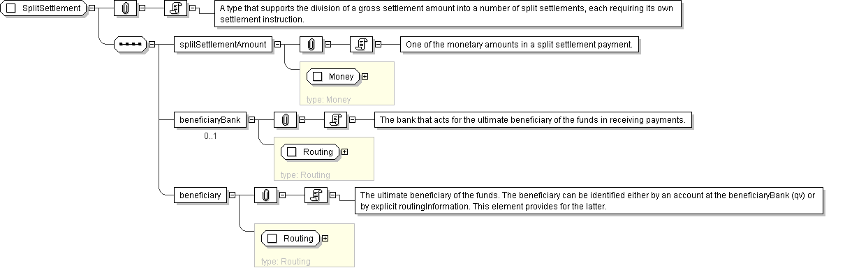 | Documentation | A type that supports the division of a gross settlement amount into a number of split settlements, each requiring its own settlement instruction. |