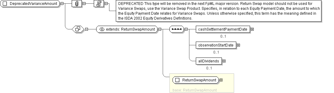 | Documentation | DEPRECATED This type will be removed in the next FpML major version. Return Swap model should not be used for Variance Swaps, use the Variance Swap Product. Specifies, in relation to each Equity Payment Date, the amount to which the Equity Payment Date relates for Variance Swaps. Unless otherwise specified, this term has the meaning defined in the ISDA 2002 Equity Derivatives Definitions. |