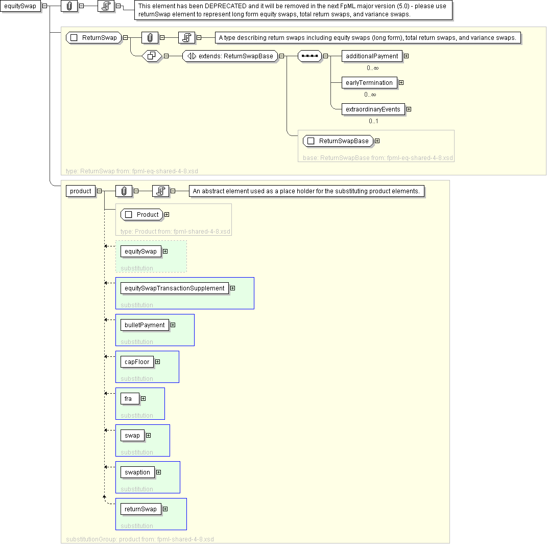 | Documentation | This element has been DEPRECATED and it will be removed in the next FpML major version (5.0) - please use returnSwap element to represent long form equity swaps, total return swaps, and variance swaps. |
