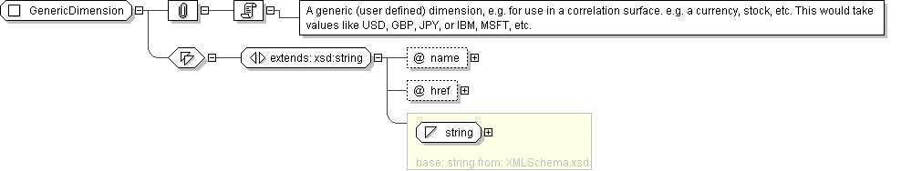 | Documentation | A generic (user defined) dimension, e.g. for use in a correlation surface. e.g. a currency, stock, etc. This would take values like USD, GBP, JPY, or IBM, MSFT, etc. |